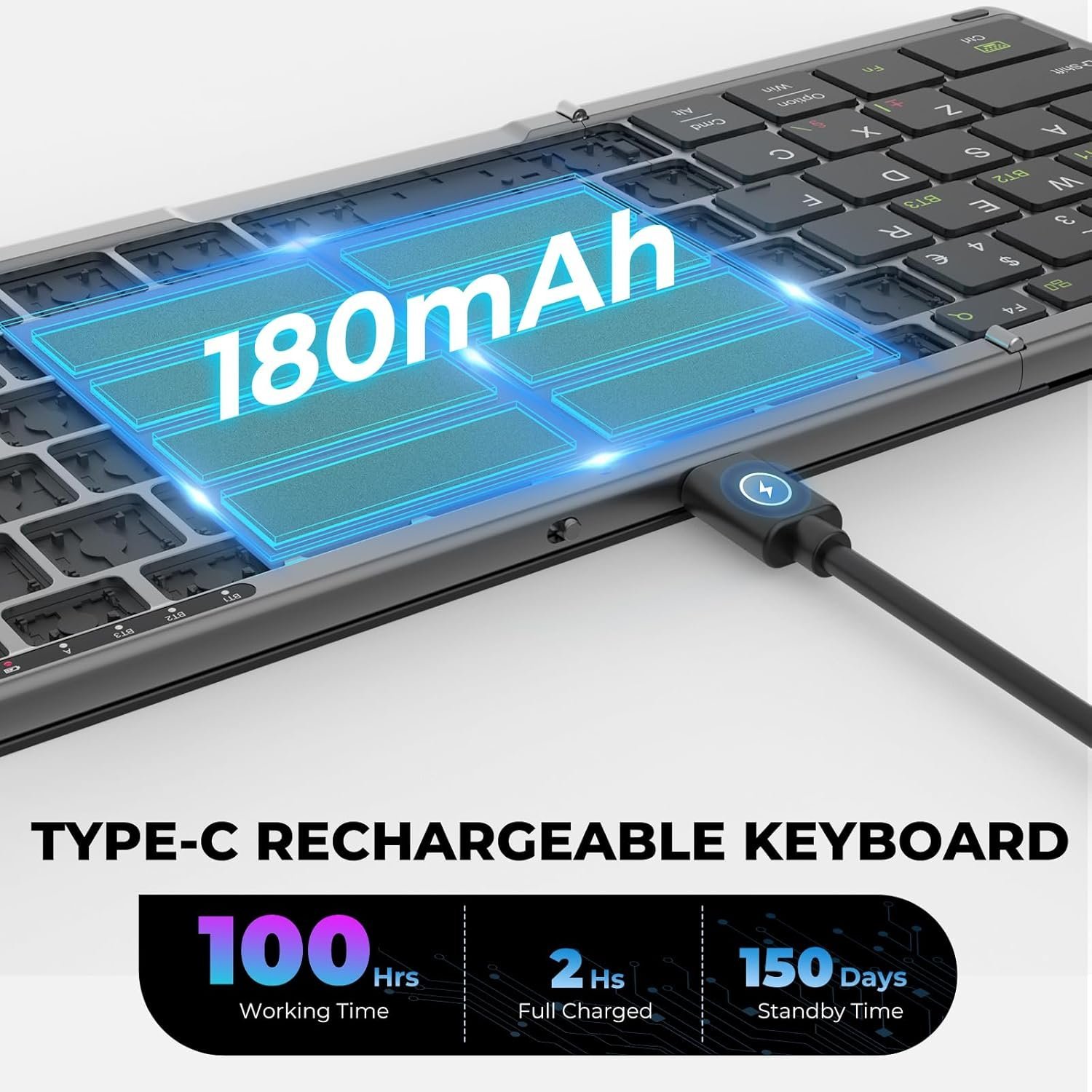 - Rechargeable and Long Battery Life :The small keyboard is equipped with a 180mAh battery, which can be used for 100 hours and standby for 5 months when fully charged via supplied Type C charging cable. The charging time is 2 hours. Auto sleep mode (after 10 minutes of inactivity) for saving power.