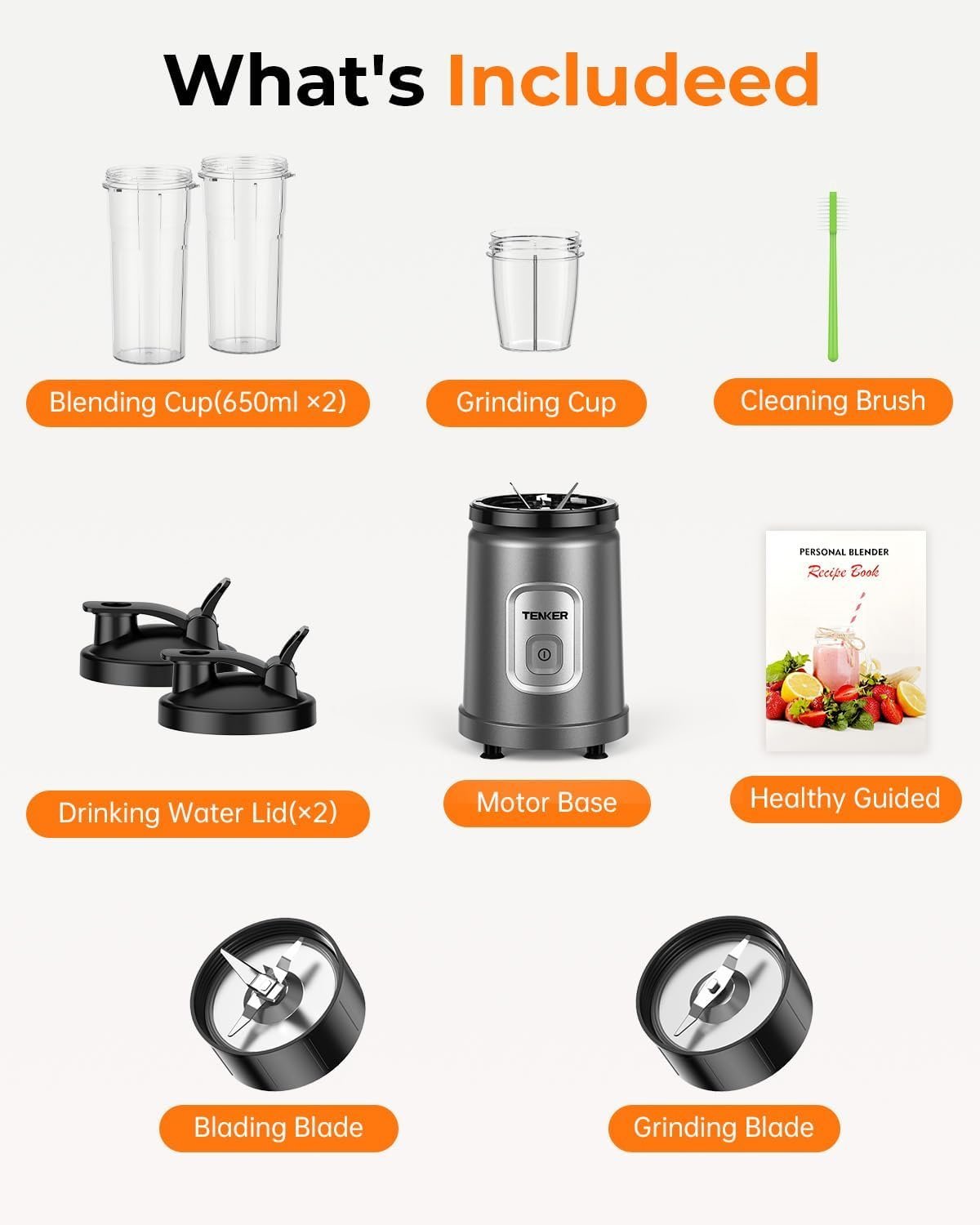 • [WHAT’S INCLUDED] 1*450W Motor base; 2*650ml BPA-free portable blending cup and lid; 1*Blending Blade Assembly; 1*Grinding Blade Assembly; 1*Grinding Cup; 1*Clean Brush; 1*User manual and recipes